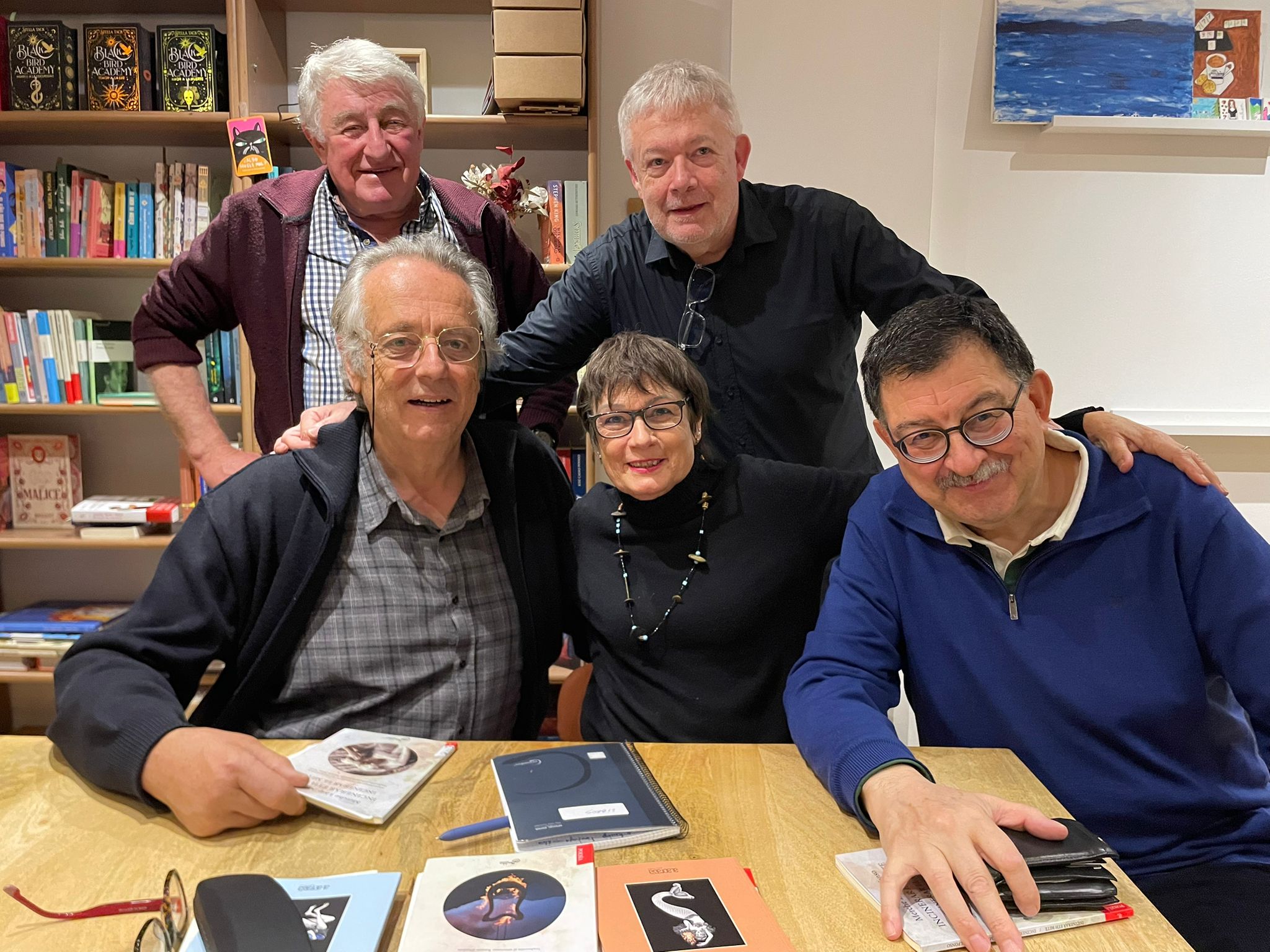 Ena fòto de portada era autora, Merche Llop damb: eth traductor, Ramon Sistac, damb eth president dera Acadèmia, Jèp de Montoya, er expresident dera Acadèmia, Jusèp Loís Sans, e eth president dera seccion aranesa, Miquèu Segalàs.